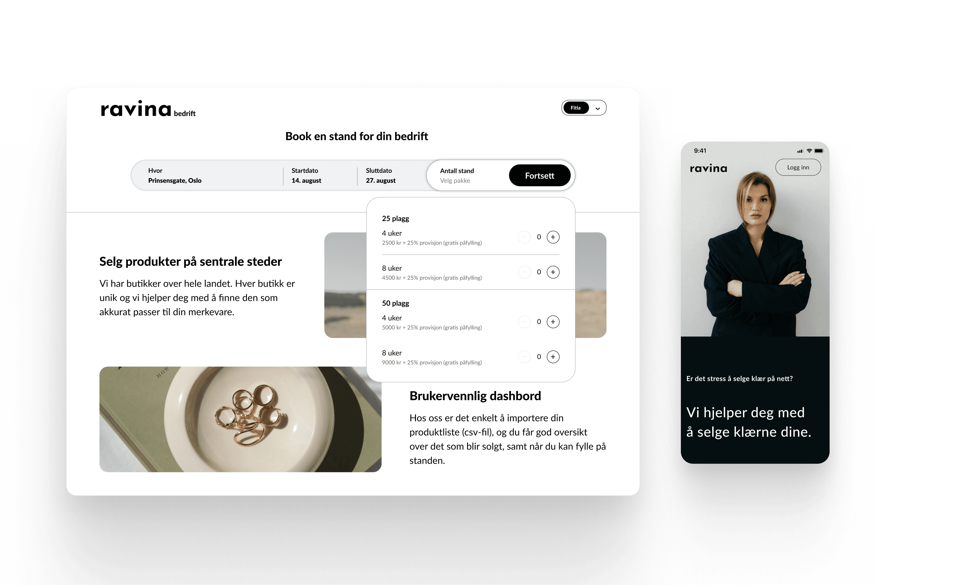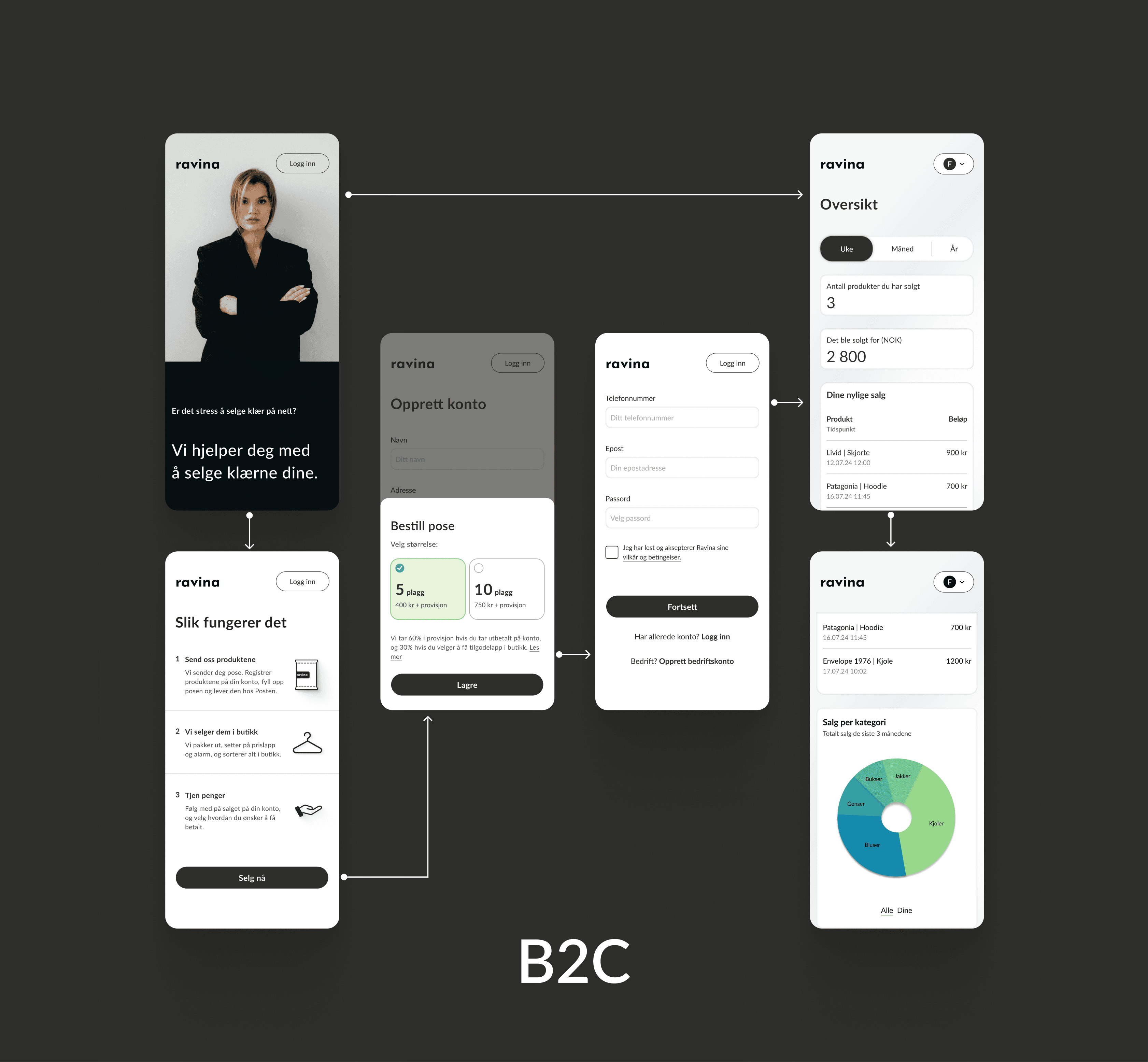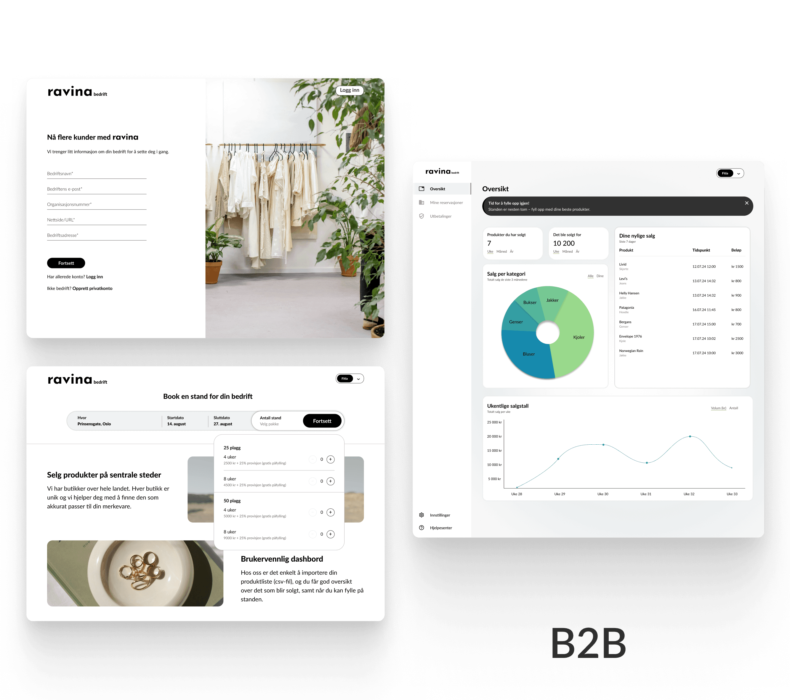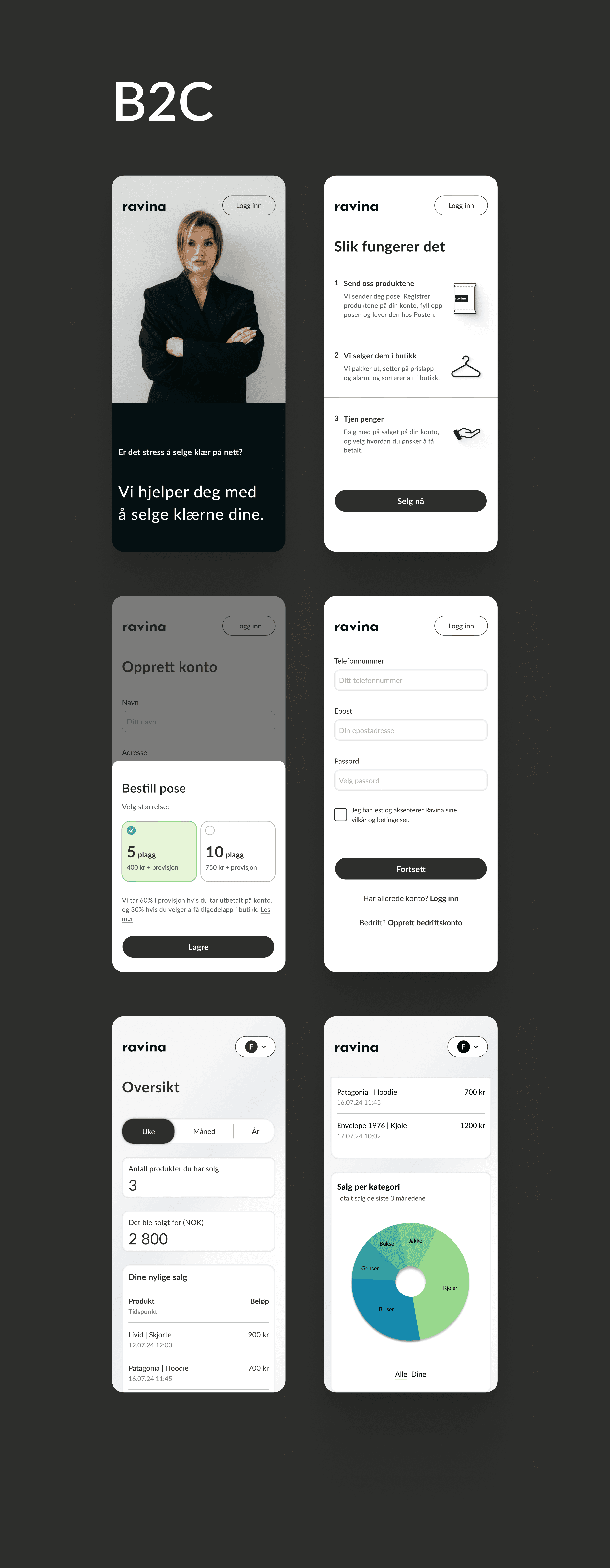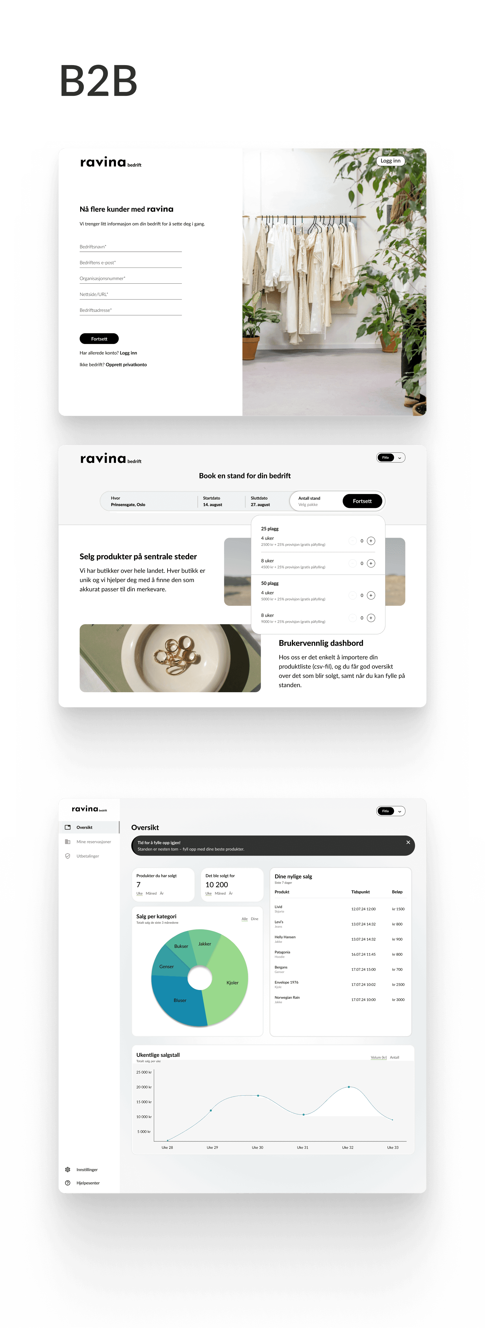 Ravina's brand colors have always been black and white, maintaining a minimalistic and clean vibe that allows the clothes and accessories to shine. Sustainability is a core value of the venture, but green tones are used sparingly to keep the focus on fashion. Instead, green is used strategically within the design to symbolize the amount of sold items, representing a small victory for the planet with each transaction. The dashboard is designed to be intuitive and straightforward, catering to the needs of both business and consumer users.
